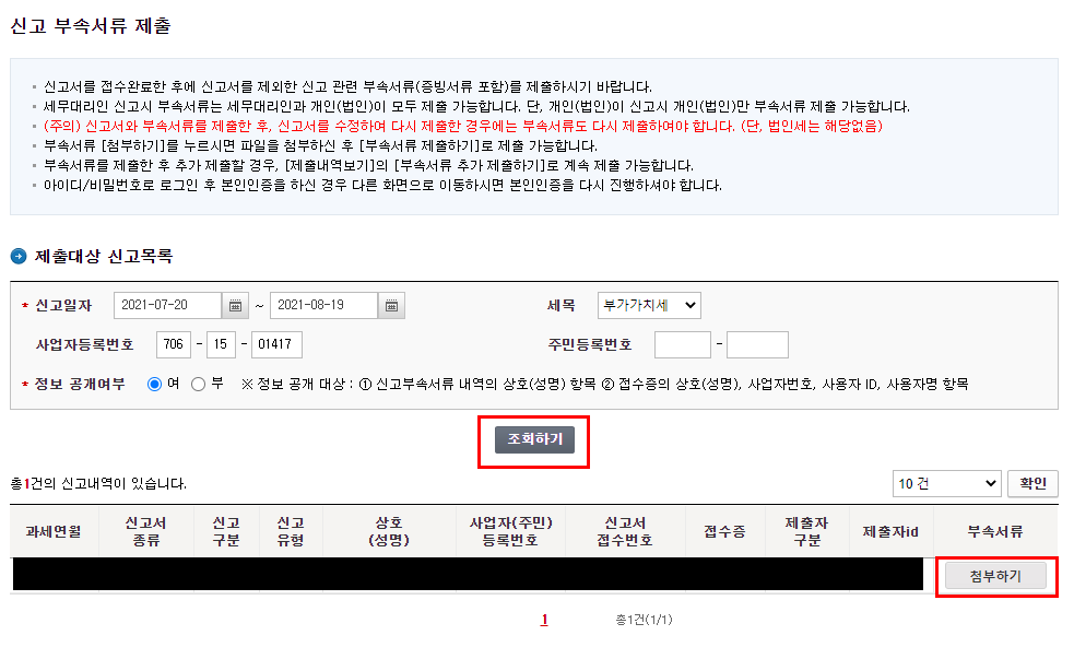홈택스 홈화면에서 신고/납부 - 부가가치세를 누르면 Step 2.신고내역에서 조회하기를 눌러줍니다. 방금 신고한 신고서가 보일텐데, 최우측에 부속서류 제출여부 N를 눌러줍니다.
