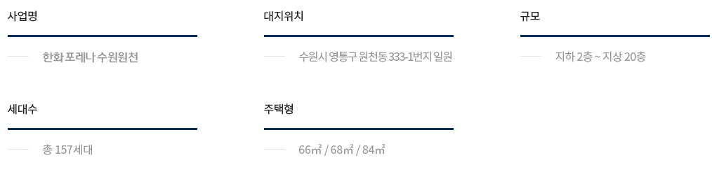 포레나 수원원천은 지하 2층~지상 20층, 2개 동, 전용 68~84㎡ 총 157가구 규모다. 전용면적별로 △68㎡ 117가구 △84㎡ 40가구 등이다.
