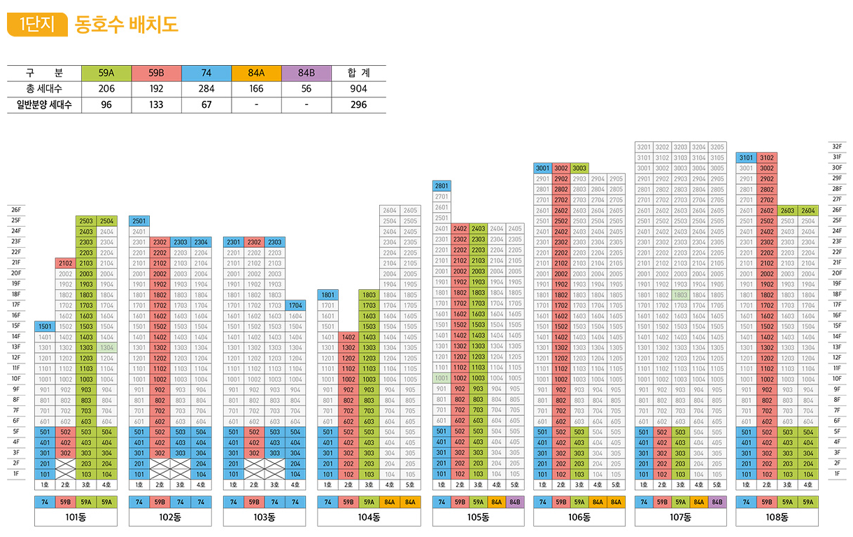 안양 융창아파트 주변지구 주택재개발 정비사업을 통해 들어서는 ‘평촌 트리지아’는 3개 단지에 지하 5층~지상 34층, 총 22개동, 전용면적 36~84㎡, 7개 타입(임대 포함), 총 2,417세대(임대세대 196세대 포함) 규모의 대단지 아파트다. 이 중 일반분양은 전용 59~74㎡, 913세대다. 타입별 일반분양 세대수는 △59㎡A 478세대, △59㎡B 276세대, △74㎡ 159세대다.