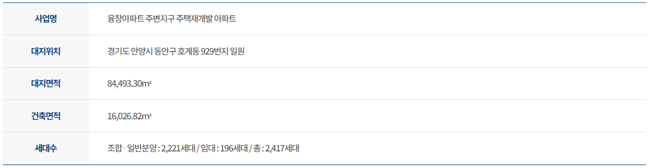 또한 워낙 교육열이 높으며 학군이 좋은 평촌이기에 안양시 당해에서 마감될 것으로 예상되며, 85제곱미터 이하 세대만 일반분양하기 때문에 100% 가점제가 적용된다. 안양시 2년이상 거주자라면 무조건 관심을 가져야 할 곳.
