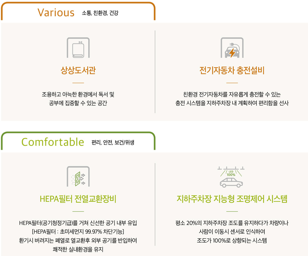 입주민들을 위한 실용적이고 활용도 높은 여러 커뮤니티 시설도 설계된다. GX룸, 스트레칭실에서 간단한 운동이 가능하며 휘트니스센터, 실내골프연습장 등이 마련돼 멀리 나가지 않아도 취미 활동을 즐길 수 있다. 키즈카페, 상상 도서관, 독서실은 물론 단지 내 어린이집 등 자녀들을 위한 시설도 다양해 아이 키우기에도 좋다. 게스트룸에 지인들을 초대할 수 있고 클럽하우스, 골든라운지 등에서 입주민 간 친목 도모도 가능하다.