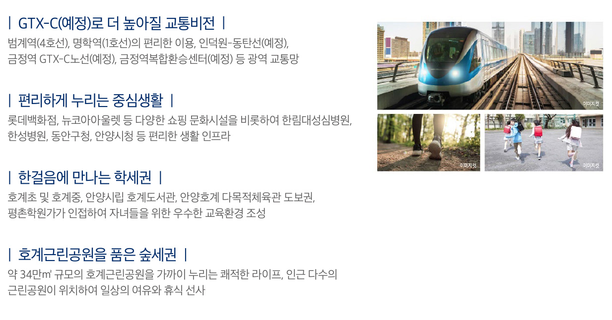 안양시 부동산 시장이 연이은 교통호재로 뜨겁게 달아오른 가운데, 가장 큰 호재로 GTX-C 노선(2026년 개통 예정)이 손꼽히며, 이 노선은 단지와 가까운 금정역을 지날 예정이다. 또한 인덕원-동탄선(2026년 개통 예정)과 월곶 판교선(2025년 개통 예정)도 계획돼 있는 만큼 향후 서울 및 수도권 주요 지역 접근성은 물론 안양 내 이동성도 더욱 개선될 전망이다.